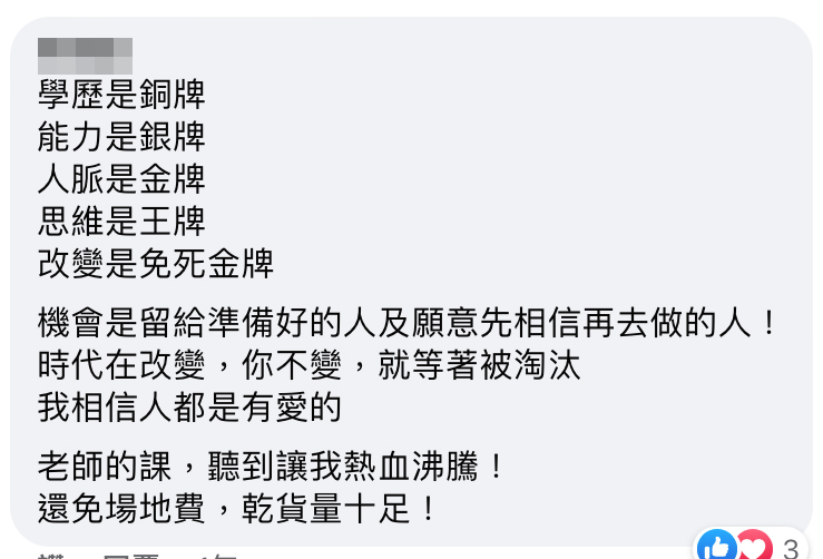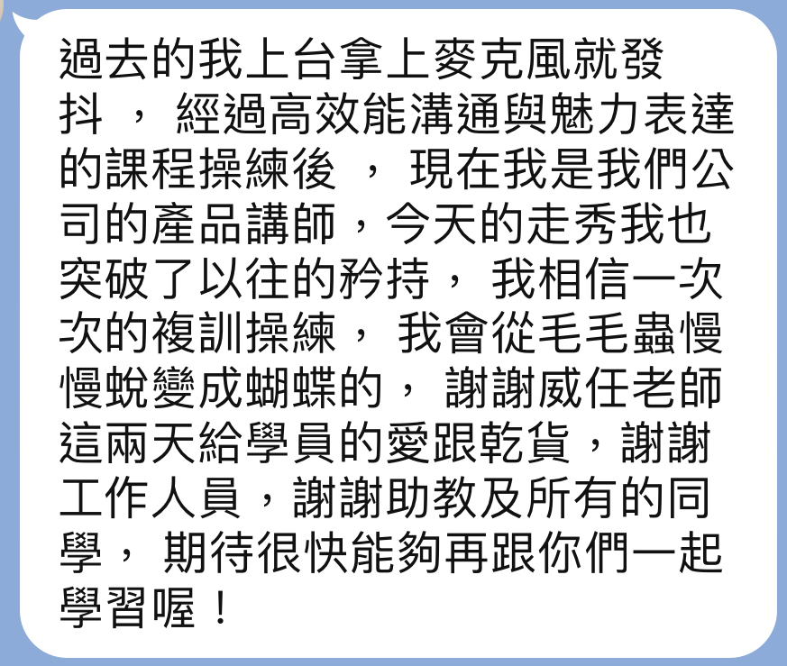 學員分享回饋 打造好口才影響力 這是一門為表達初學者設計的入門課,協助你克服講話沒重點、開口緊張與邏輯混亂的問題。 從心理自信、說話結構到簡單表達技巧,一步步建立讓人聽得懂、聽得進、願意回應的語言力。 立即報名免費課程 合作共贏行銷顧問有限公司歡迎跟著我走進這趟自信表達的成長旅程